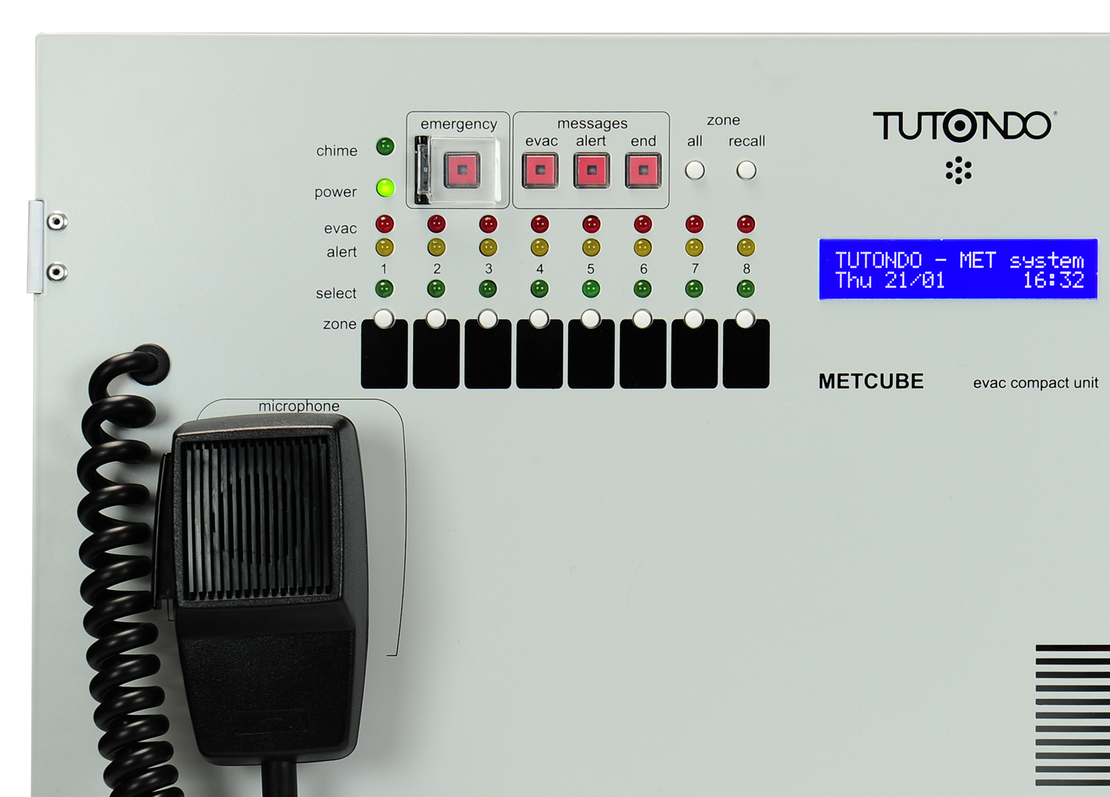 L'impianto audio EVAC puo' essere composto da una unità modulare con controllo e visualizzazione degli eventi, che si interfaccia con la centrale antincendio per l’attivazione ed invio di messaggi vocali di emergenza.